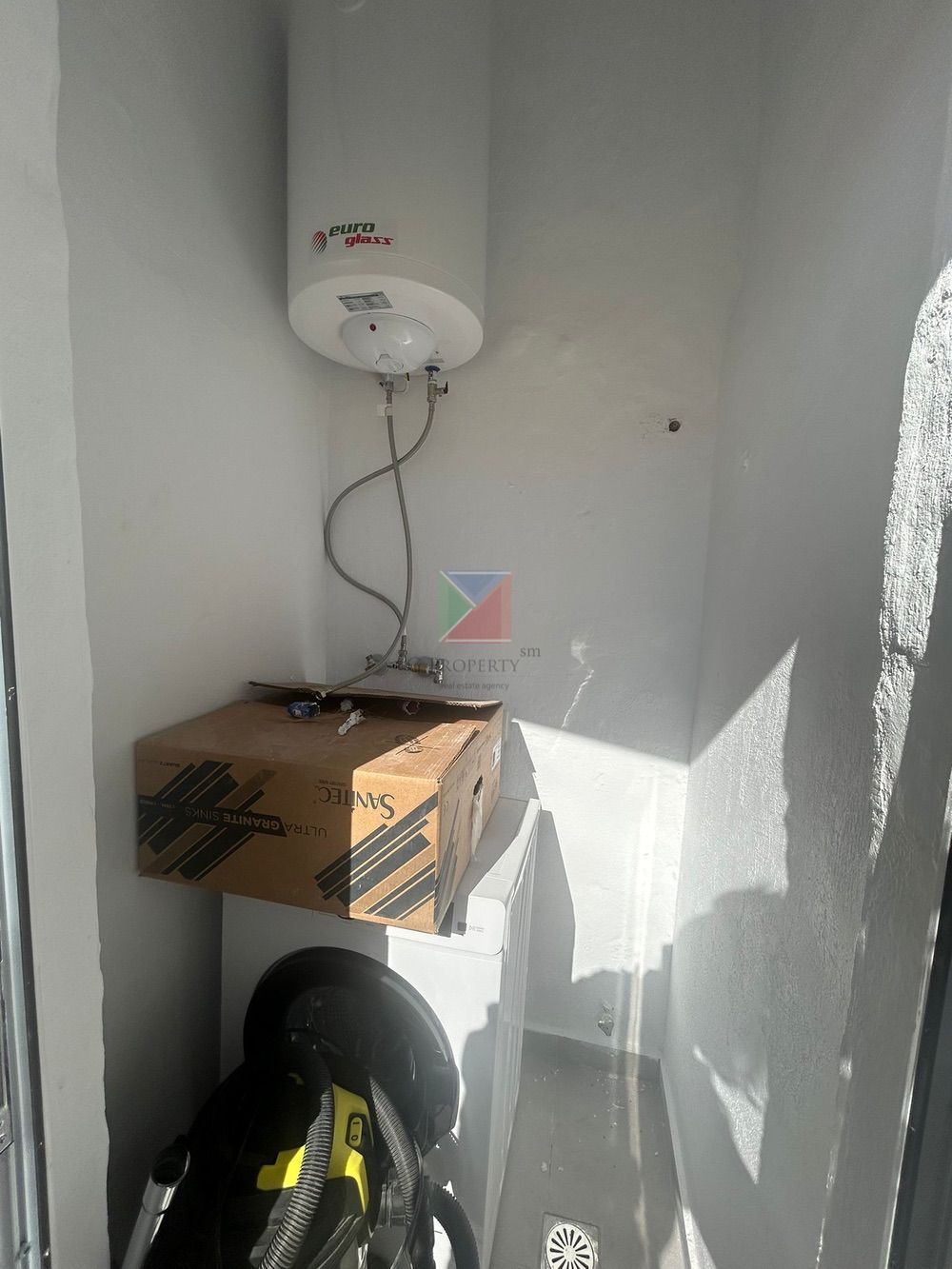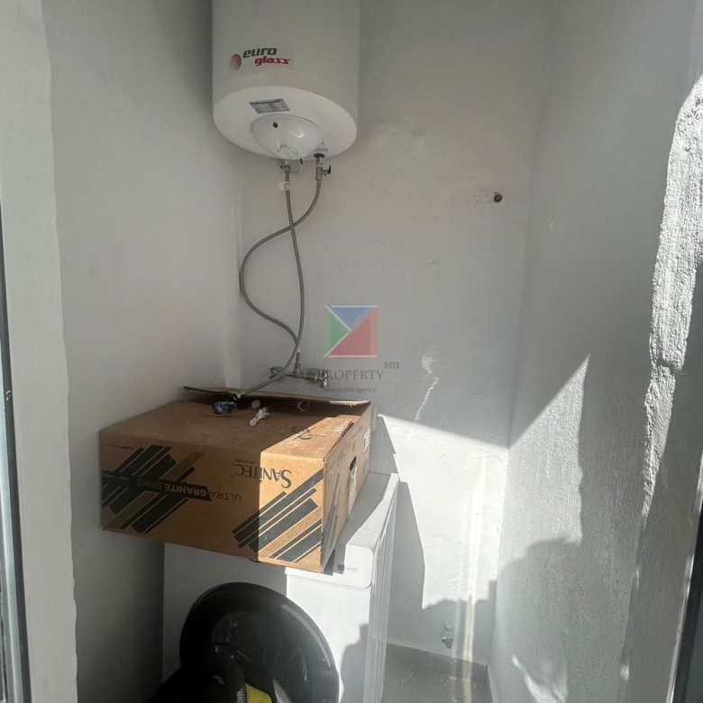 There is also a smaller rear balcony connected to the second bedroom, where there is a small storage area with the washing machine.